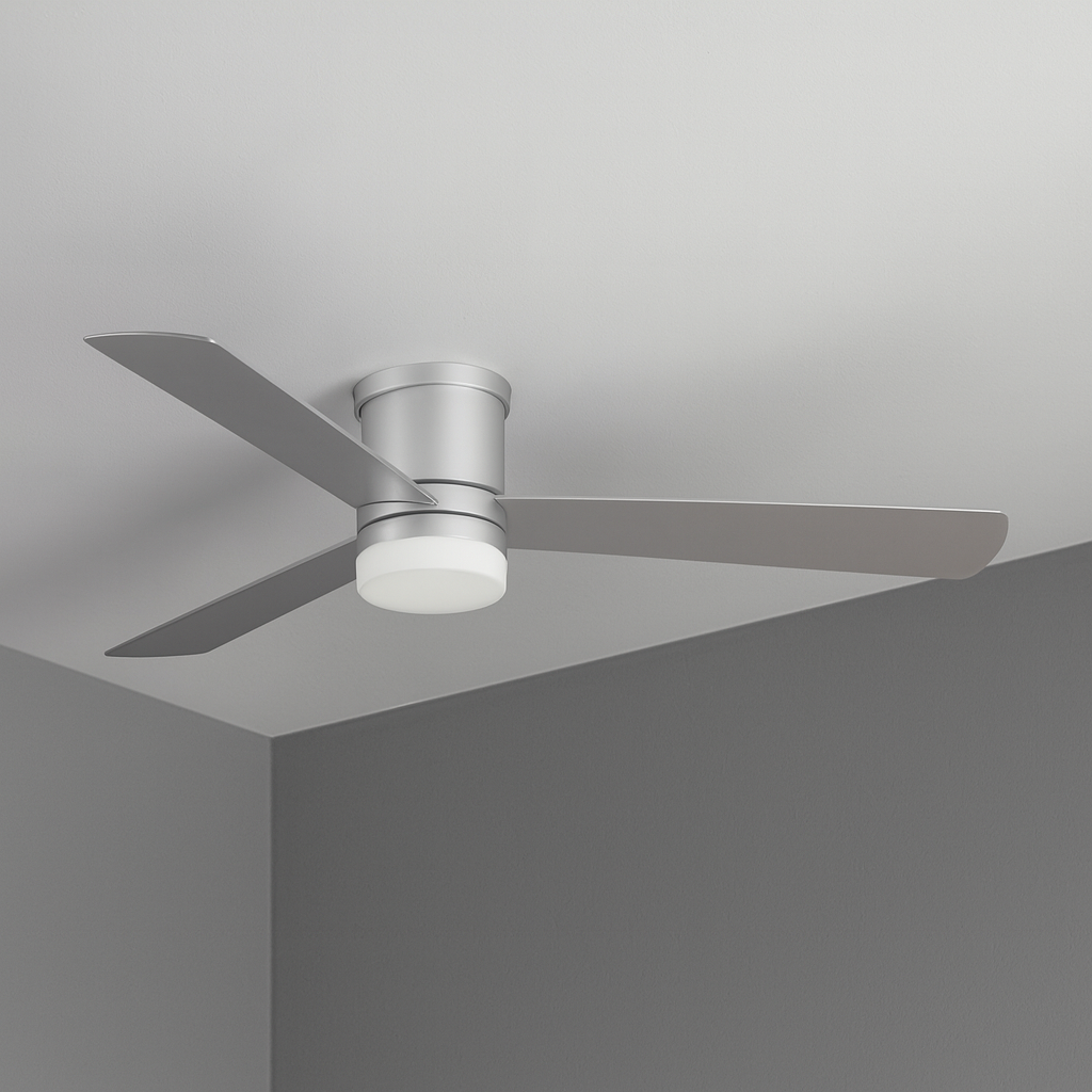 moteur acier couleur inox et pales en contreplaqué effet inox ( livré avec jeux de pales chêne et pales blanches)