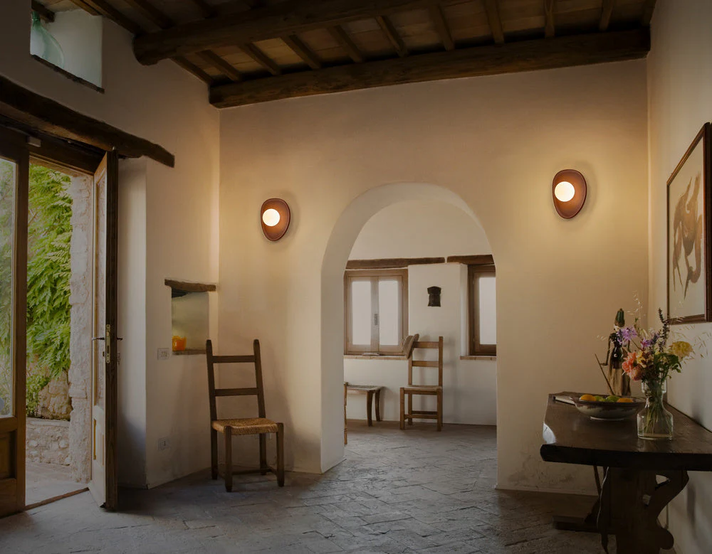 applique en béton couleur terre cuite et globe en verre blanc