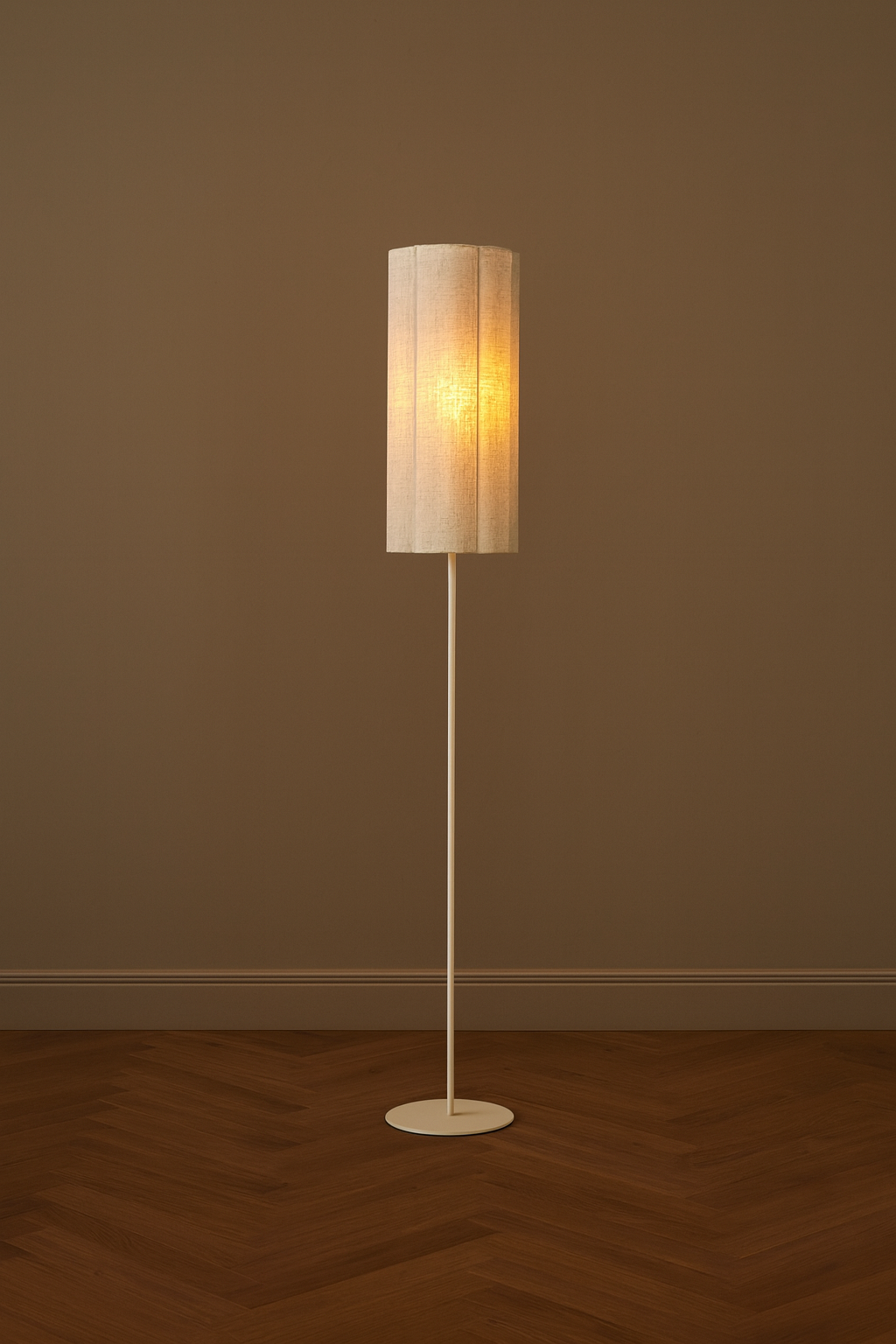abat jour en lin beige, socle en métal beige, fil coton beige