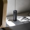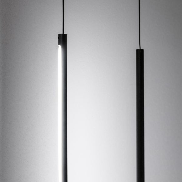 Rosace, corps lumineux et base au sol en métal poudré noir, Câble de support en PVC noir.