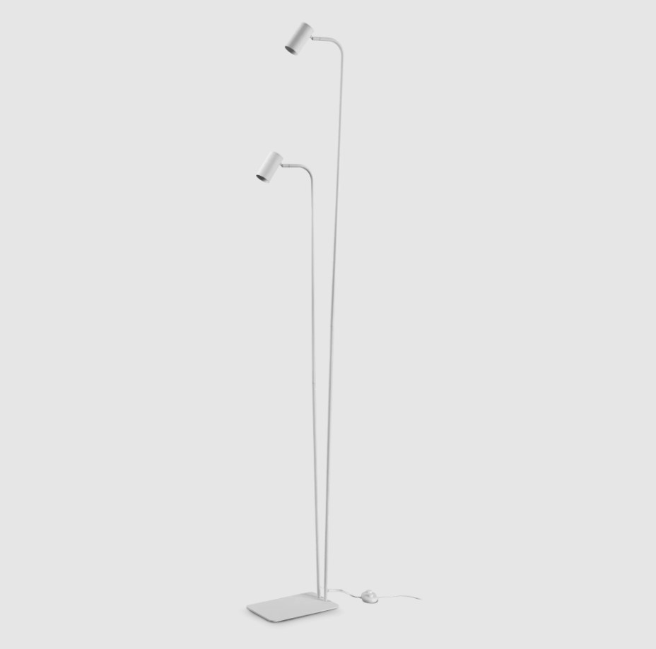 Base et corps lumineux en métal poudré blanc, têtes orientables, Câble en pvc avec interrupteur et fiche.