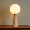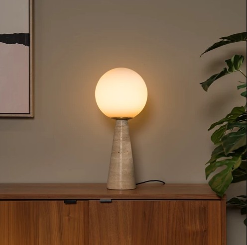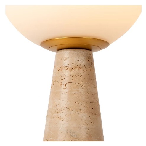 Base travertin massif, abat-jour en verre opalin et bague en laiton brossé