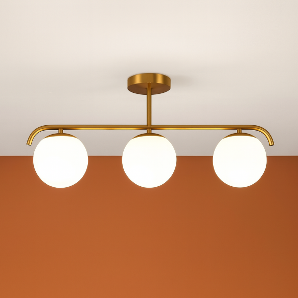 métal or mat et 3 globes en verre opalin
