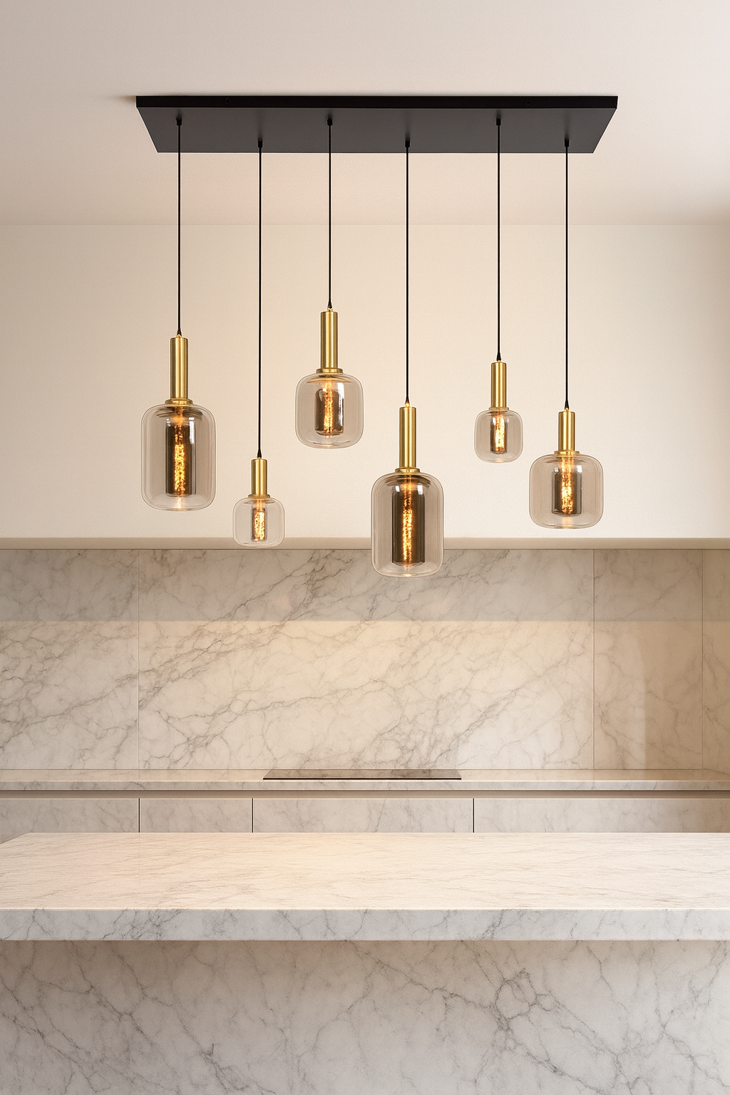 6 pendants en verre soufflé, détails  finition laiton brossé