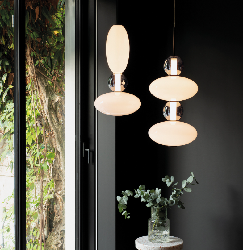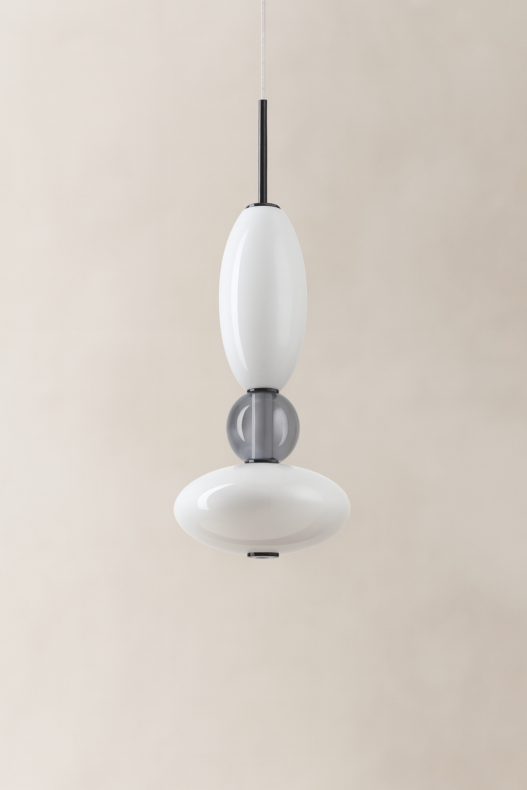 Globes en verre gris et verre opalin soufflés bouche, structure en métal noir mat, tube LED traversant