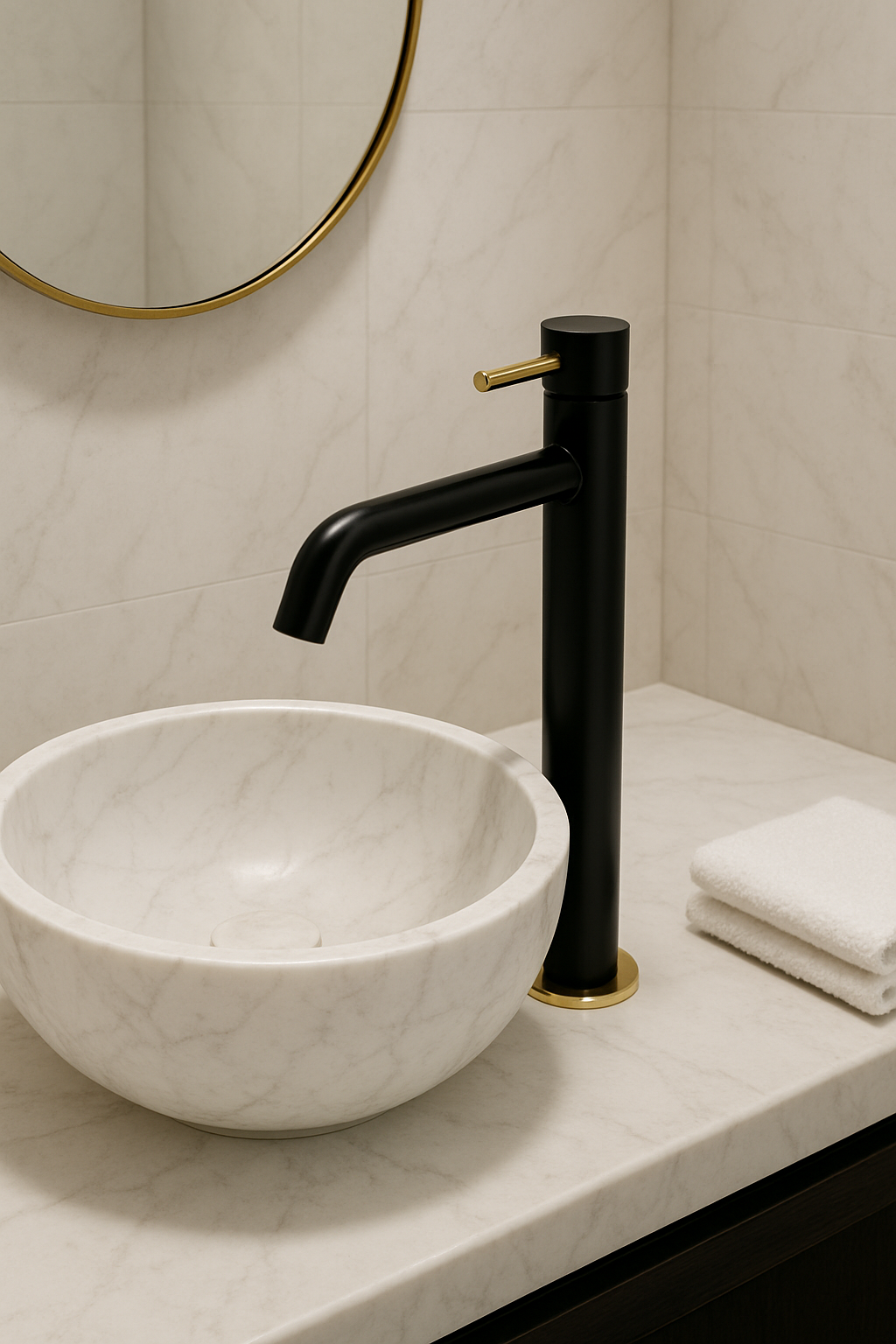 Mitigeur haut en laiton finition époxy noir et  PVD or poli