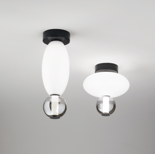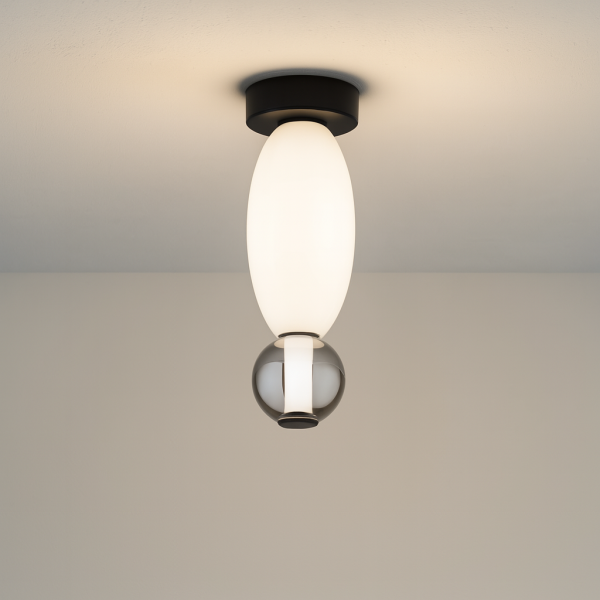 Globes en verre gris et verre opalin soufflés bouche, structure en métal noir mat, tube LED traversant