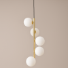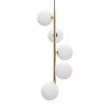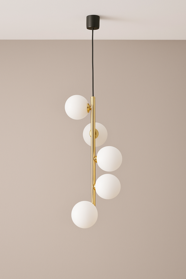 structure en métal doré brillant, 5 globes en verre opalin, fil et fixation plafond noir