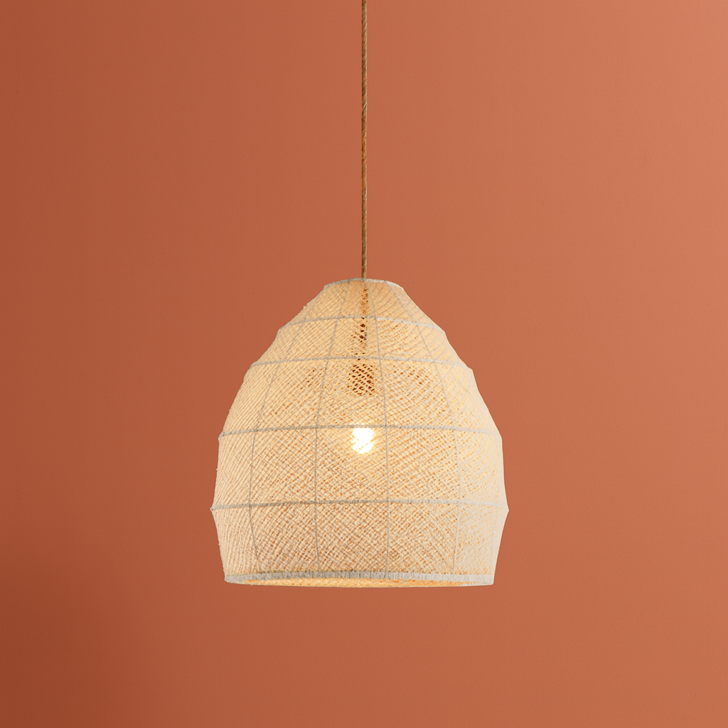abat jour en soie tressée beige montée sur une structure en métal beige, fil toile de jute et fixation noire