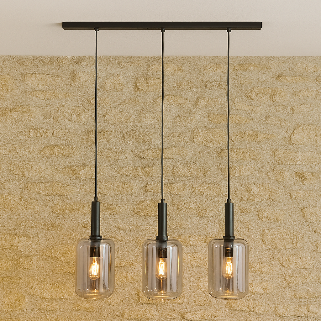 3 pendants en verre soufflé gris, douilles noires, câbles coton noir, système de fixation noir mat