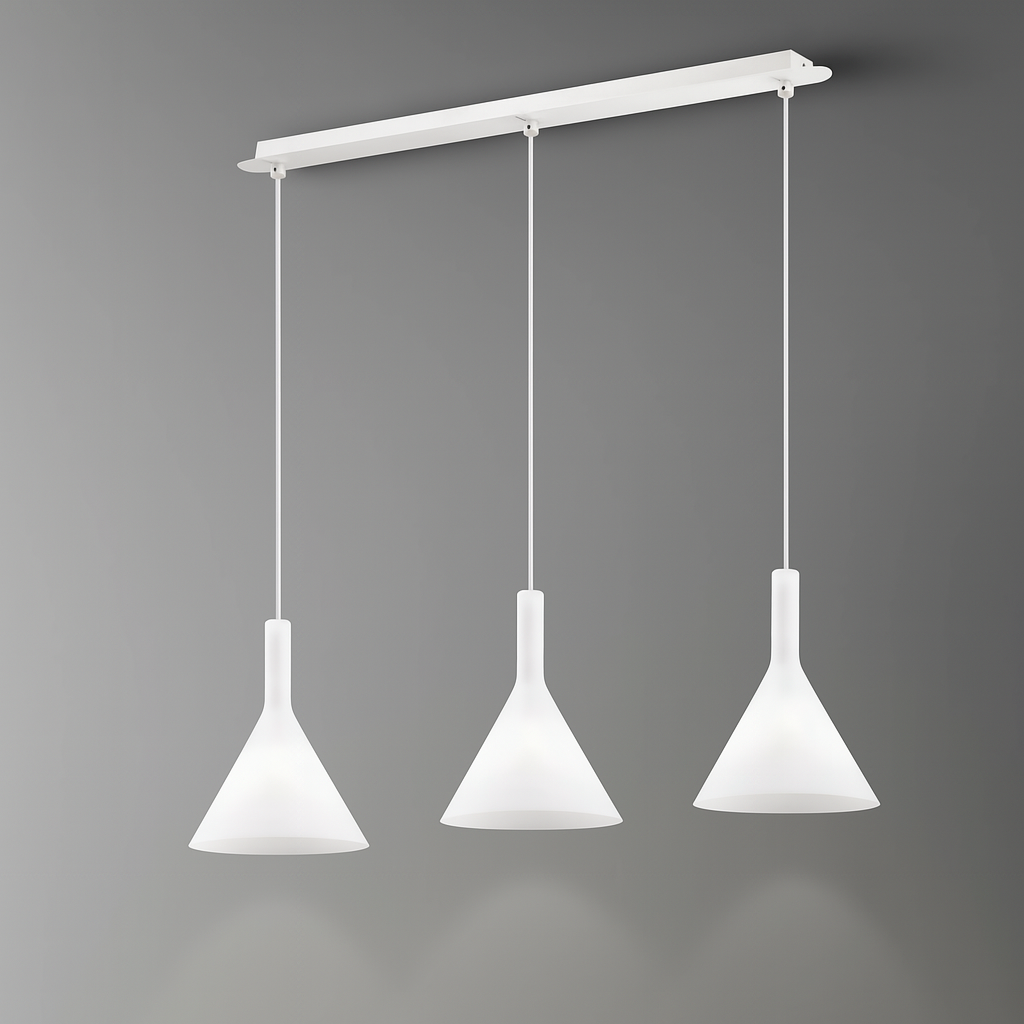 3 pendants en verre blanc monté sur une structure en métal blanc