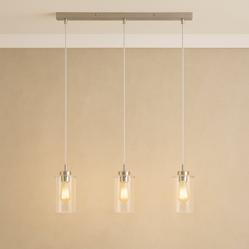 3 pendants en verre transparent, douilles et système de fixation inox