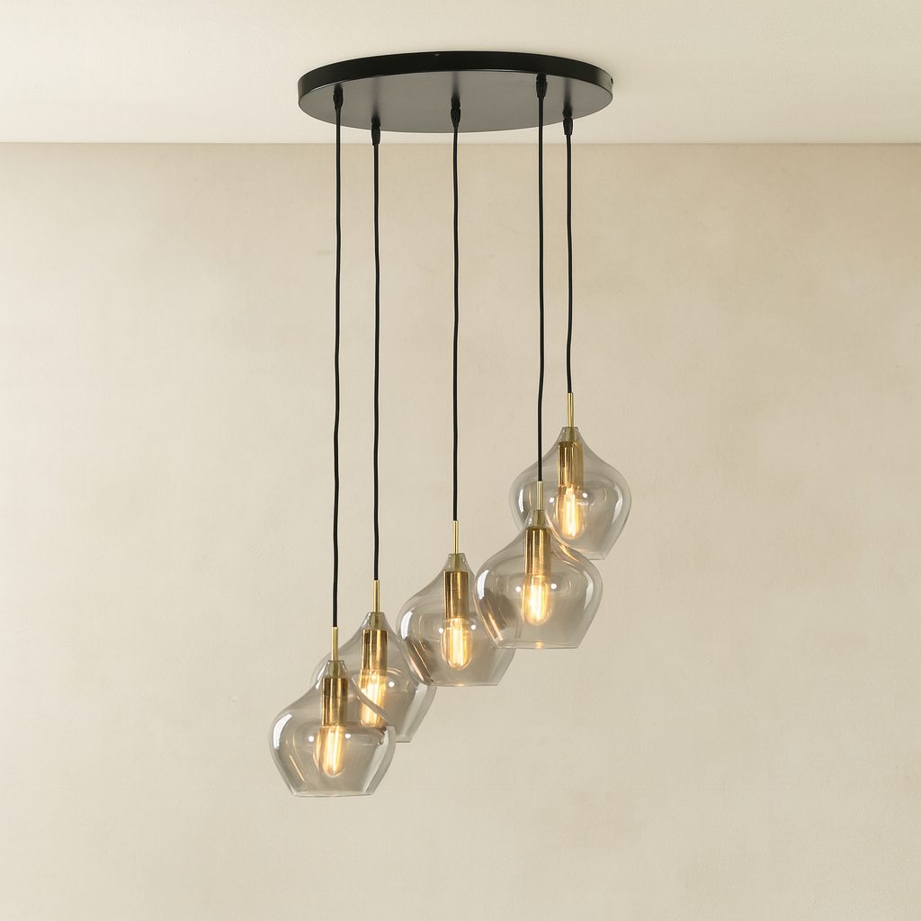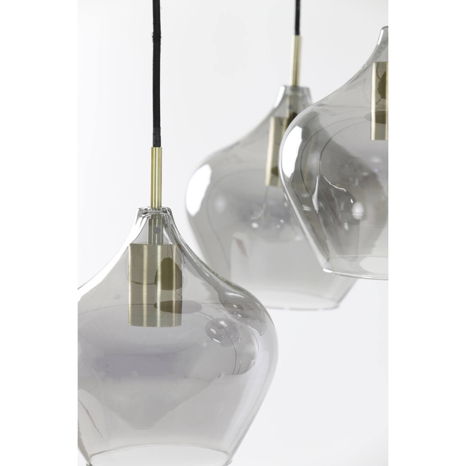 5 pendants en verre soufflé gris, douilles laiton, cordon coton noir et fixation métal noir