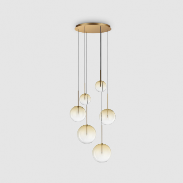 Base en laiton brossé - fils noirs - 6 globes en verre soufflé bouche (3 tailles différentes) ambrés