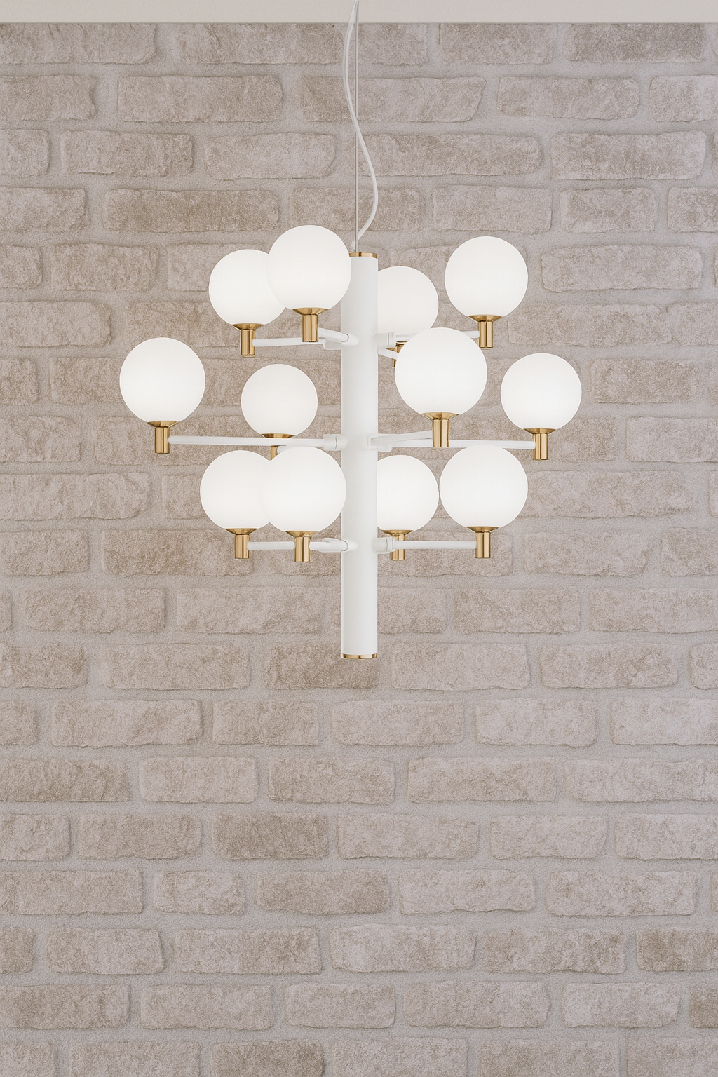 Structure métal blanc mat et bague laiton, 12 globes en verre blanc