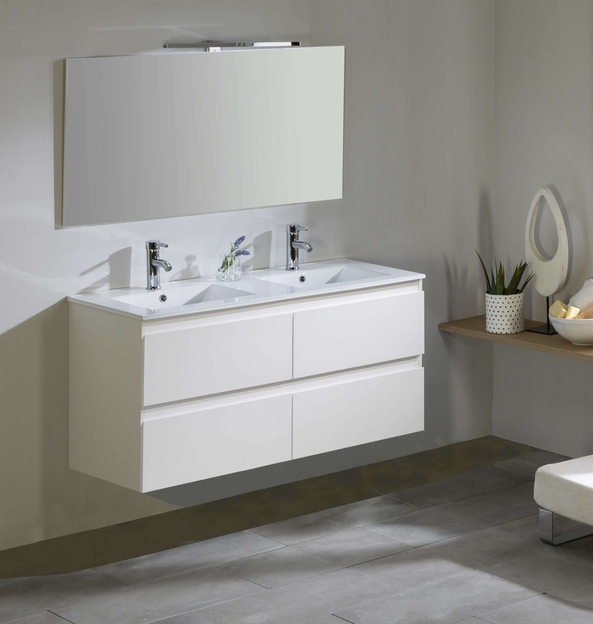 Meuble Suspendu Ibiza 4 tiroirs Blanc Brillant avec double vasque céramique intégrée blanc brillant