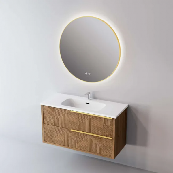 Meuble Suspendu Boston Bois stratifié Poignés Or avec vasque intégrée en Céramique