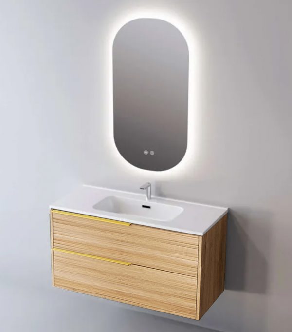 Meuble Suspendu Toronto 2 tiroirs poignées Or avec vasque en céramique intégrée blanc